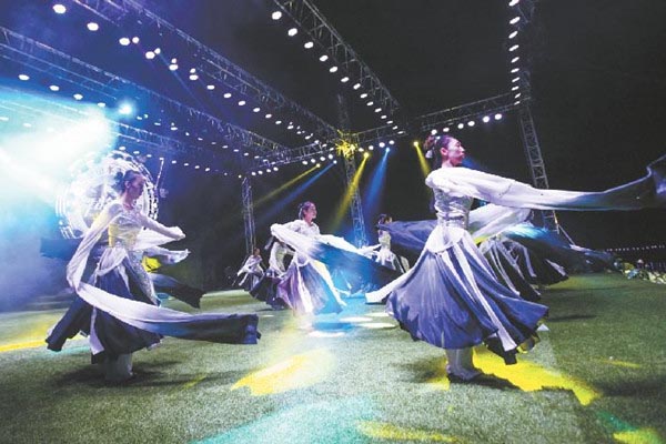 舞台依托景区的山水景观,搭建在水上,两侧是青翠山林,水中有船只往来,与水中的倒影交相辉映。晚上8点,音乐响起,灯光亮起,演出正式开演。整场演出由“太阳祭拜、子牙垂钓、鱼跃龙门、龙宫乐舞、刘勰献书、长袖起舞、丝竹问水、茶韵飘香、渔家情怀、满江红歌、好酒迎亲和向往蔚蓝”等十二个章节组成,紧扣日照历史文化和现代风情的内容,通过与现代声光电相融合,为广大游客送上了一场视听盛宴。