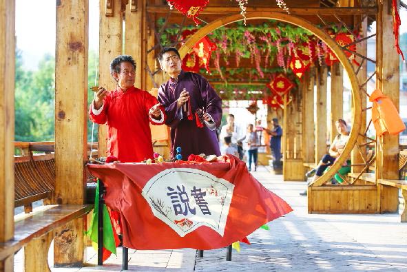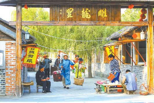 景区门口锣鼓喧天,是“龙门锣鼓队”迎宾表演;铜人表演刘勰著书、太公垂钓,游客争相合影留念;“磨剪子咯戗菜刀……”悠扬的吆喝声和货郎的叫卖声飘飘荡荡,此起彼伏,让游客的回忆回到儿时……