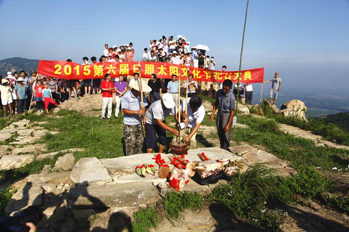8月3日(农历六月十九日)早上日月同辉。地处日照海洋城涛雒镇下元村的天台山上,“焚香奠礼”、“宣读祭文”、“太阳文化研讨”热闹非凡。市内外数百名太阳文化研究爱好者和下元村村民自发地来到天台山顶,举行了“2015日照第六届太阳文化祀日大典”民俗活动,按照民间习俗为太阳神庆贺生日。