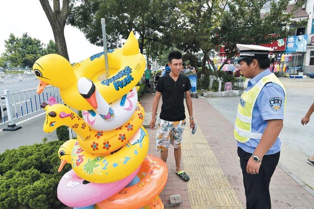 完善交通基础设施。对市区信号灯、标识线、护栏等交通设施进行经常性维护,并根据车流量变化进行精细化调整。协调有关部门和沿海民俗旅游村居,对现有停车场重新规划设计,新建、扩建,有效缓解停车压力。5月份以来,市区新建停车场16处,车位增至13600个,新安装交通隔离护栏36千米、各类交通标识126面。重点整治“举牌揽客”、“占道经营”。部分商贩、经营业主在市区主干道两侧占道经营、举牌揽客,造成极大安全隐患,损害旅游城市形象。按照市政府要求,7月下旬以来,我市警方会同城管执法、工商及街道(村居)等部门,通过宣传教育、劝导、强制清理、行政处罚等手段开展联合整治行动,目前,共发放《致我市旅游从业者的一封信》1200余份,签订承诺书350余份,纠正举牌揽客、占道经营行为1293起,处罚违法行为20余起。整治行动取得初步成效。全员上路确保畅通。屯警街面、路面,全面引流疏堵,确保畅通。在沿海景区车流人流密集区域,通过实行外围控制、内围疏导、间隔放行与警车引导等措施,确保高峰时车流平稳通过。同时,开展拉网式排查整治行动,严查酒驾、超速、超载等违法驾驶行为,并制定预案积极推进三轮车治理工作。自5月份以来,在主干道、景区共查处交通违法行为2363起,暂扣违法车辆196台次,进一步净化了沿海道路交通环境。