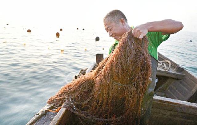 时下,山海天旅游度假区两城街道兴渔渔业公司首批试养的300多亩龙须菜陆续进入收获季节,预计亩产3000斤左右。 这批龙须菜是今年7月初从福建引进的,这次试养成功,标志日照地区的海域环境可以满足龙须菜的生长要求,对丰富我市海水养殖品种、优化当地海洋养殖结构、增加海水养殖效益具有重要意义。