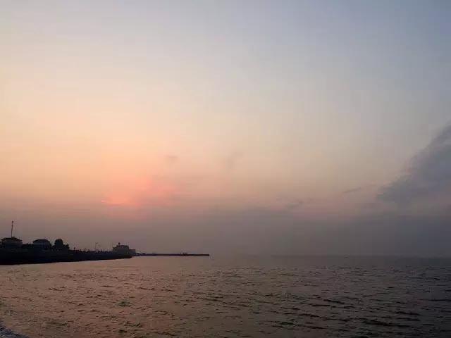 刚刚还雾蒙蒙的天空没一会儿就放晴,在浩瀚的海面上隐隐地显现出了一层丹红色。此时,厚厚的雾气也慢慢游散开去,天空也由灰蓝变成了橘红。光灿灿的凶猛的大海此刻变成了平静,海风也变得越发柔和,等待中的人们呼吸着这一天当中的第一口生气。