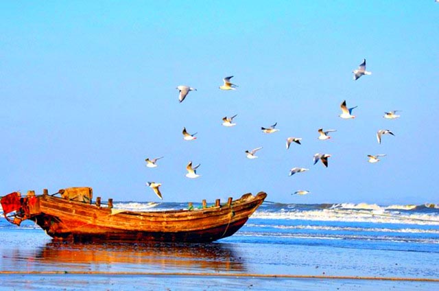 ↑清晨,水杉带着雨露,海浪卷席着沙滩,回首,恰遇第一缕光!
