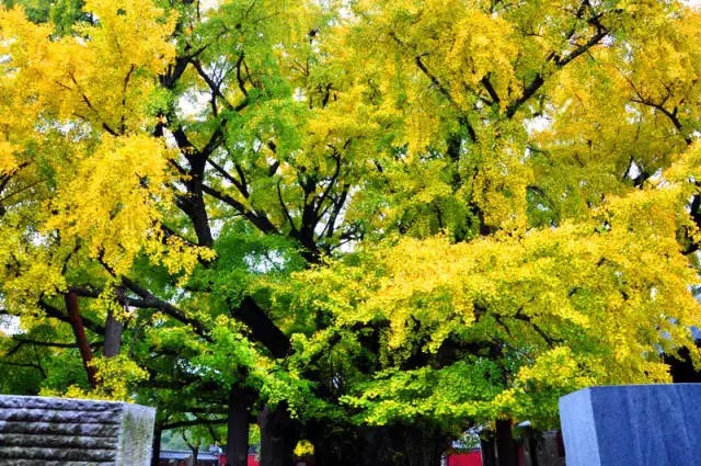雨大了起来,雨丝变成了雨线,扯天扯地垂落,满世界都是“哗哗”的雨声。我不想被淋成落汤鸡,赶紧躲到定林寺里避雨,算是提前相遇了寺院里的“天下银杏第一树”。这棵树是每来必看的,说是提前相遇,不过说我是被雨撵来的。虽然是寺庙,但我笃定,这里的主角是这棵树而不是大雄宝殿里的佛。这棵树的历史比佛要早:前715年(鲁隐公8年)鲁莒会盟时,它就是见证者,而佛祖却生于前623年,要晚许多年;这棵树为世间仅有,而供奉如来佛祖的寺庙却遍地都是。所以,说大树是主角,应该不会有轻慢佛祖之意。现在,佛祖端坐在大雄宝殿里歆享贡祭,我和几个游山的人躲在宝殿的檐下避雨,大树却站在寺院里欣然接受着这场大雨的洗礼。银杏树枝繁叶茂,厚重如山,它稳稳地站在院落当中,不摇不动,不躲不闪,而大雨并不能完全打湿它健硕的身躯。急雨打在银杏树叶上“噼啪”作响,鲜亮的银杏树叶摇摇摆摆,似藏不住满心的欣悦欢喜。急雨打在大雄宝殿的殿顶,“泠泠”有声,雨水顺着檐沟流下来,像是垂下玲珑的珠帘。雨水先是洗亮了寺院里的青石板,继而雨水汇聚,四流而去。周围山峰隐在云雾里,一时看不清楚。