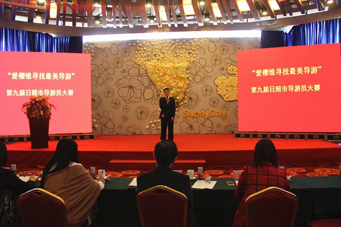 为加强我市导游员队伍建设,进一步提高导游队伍的整体素质和业务水平,推动旅游行业的文明建设,集中展示魅力日照的文化内涵和城市形象,由日照市文明办、日照市总工会、共青团日照市委、日照市妇女联合会、日照市旅游局、日照广播电视台(集团)联合主办的“爱樱维”寻找最美导游—第九届日照市导游大赛暨“十大文化旅游目的地品牌”旅游线路设计大赛总决赛于10月29日上午在日照蓝海国际大酒店正式拉开帷幕。