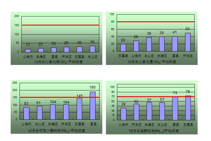 10月份,二氧化硫平均浓度最低的是山海天旅游度假区,最高的是岚山区。二氧化氮浓度最低的是五莲县,最高的是日照经济技术开发区。PM10浓度最低的是山海天旅游度假区,最高的是莒县。PM2.5浓度最低的是山海天旅游度假区,最高的是五莲县。