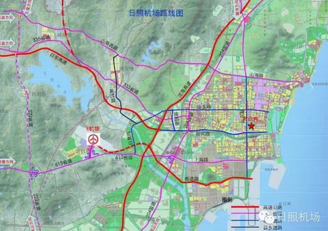 日照机场于2015年12月22日通航,市民可通过以下路线到达机场。如图示:
