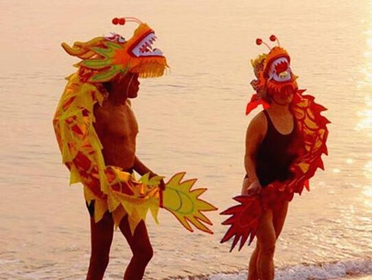 早上太阳刚一升起,担负舞龙任务的几名运动员就在凛冽的寒风中脱掉棉衣,換上泳装,披上鲜艳夺目的龙套面具走进刺骨的海水中。他们时躺时立、揺头摆尾、翻转腾越,互相变换着姿势和表演衣样。摆出“蛟龙出水”、“二龙戏珠”、“龙腾虎跃”等经典造型。