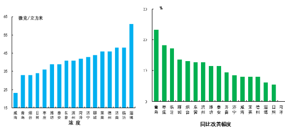 二氧化硫浓度最好的城市是威海市,为17μg/m3,最差的城市是淄博市,为83μg/m3;17市均同比改善,同比改善幅度最大的城市是临沂市,为40%。