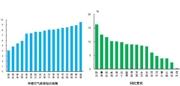 细颗粒物浓度最好的城市是威海市,为38μg/m3,最差的城市是德州市和聊城市,为101μg/m3;同比改善幅度最大的城市是临沂市,为17.4%;东营市同比持平;仅聊城市同比恶化1%。