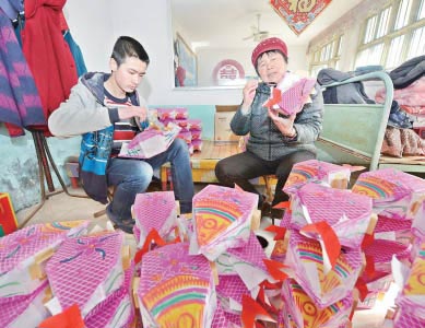 涛雒村民手工制作日照沿海特色鱼灯笼 2月1日,涛雒镇成家廒头村,村民赵龙英(右)在和孙子成振制作具有日照沿海特色的鱼灯笼。当天,民间艺人成立升和老伴赵龙英一家在家中制作鱼灯笼,准备春节期间投放市场,刚放寒假的孙子成振也帮忙赶制。 成家廒头村曾经是传统的灯笼村,200多户村民,80%的人家冬闲季节从事这种行当。现在,塑料灯笼、电子灯笼的兴起,影响了市场,但成立升老人制作的手工灯笼仍然受到怀旧情怀“粉丝”们的青睐。