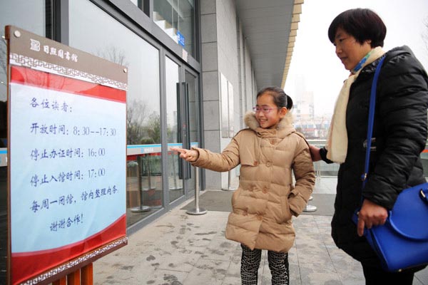 2月22日,在日照图书馆门前,市民在查看开放时间。 当日是日照图书馆“闭馆日”,仍有许多不知情的市民吃了个“闭门羹”。 记者从日照图书馆获悉,图书馆冬季开放时间为8:30—17:30,夏季开放时间为8:30—18:00,中午不休。周末及法定节假日照常开放。 同时,除法定节假日,每周一图书馆将闭馆一天。