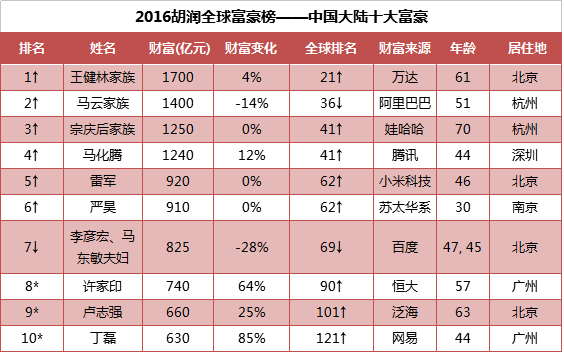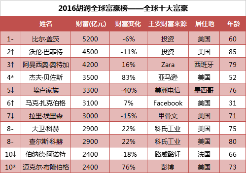 昨天,胡润研究院发布《2016胡润全球富豪榜》,该榜单以十亿美金为基准,共计来自68个国家的2188位富豪上榜,比去年增加99人,达历年最高。