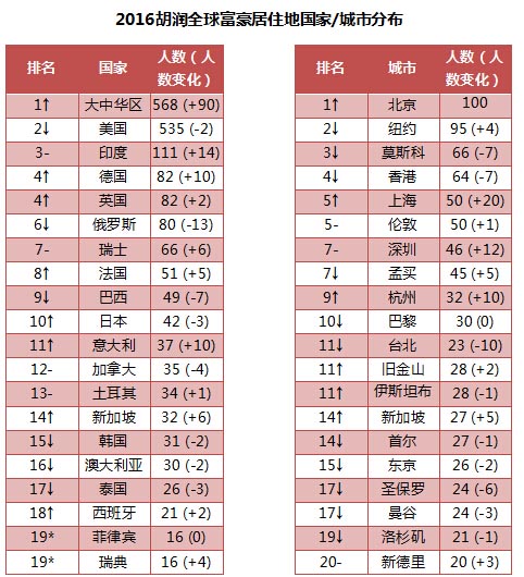 以北京为首的5个中国城市进入世界超级创业者最密集居住前10名城市,其中北京、香港、上海、深圳和杭州分别为100人、64人、50人、46人和32人。这些富豪平均年龄为56岁,其中503位白手起家(94%),中国是世界上创造“白手起家”富豪最多的国家。