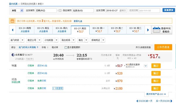 根据携程网的消息,目前在携程网自3月27日起已经可以预定日照至北京、郑州、重庆、厦门的航班飞机票。