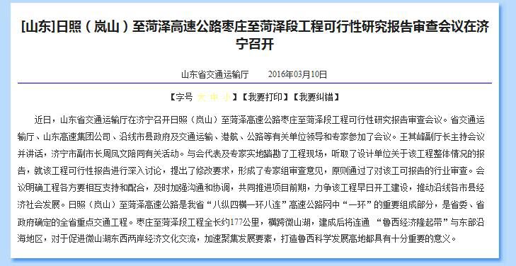 日照(岚山)至菏泽将通高速公路 贯穿鲁南五市(2016年03月12日)