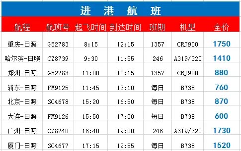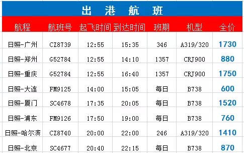 从日照可以飞这8个城市了!以下是航班信息及全票的价格: