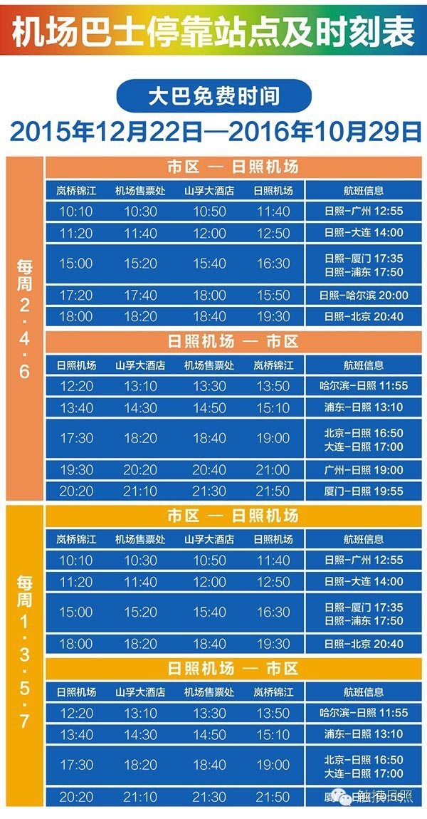 另:附上日照机场巴士停靠站点及时刻表,供各位旅客参考。