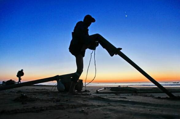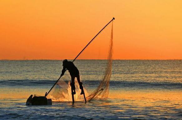 海虾生性胆小,活动在岸边平坦的浅水水中,如果用船捕捞往往会受惊而逃。因此,这里的先民创造了踩着高跷捕捞海虾的劳作方式。他们所用的虾网如同簸箕,网杆长达5米多,网口宽度也近4米;所踩的高跷,一般分为两到三节,每节高约1米,根据距离海岸的远近,随海水的深浅而增减高跷的木杆。