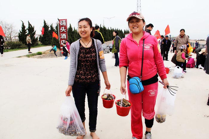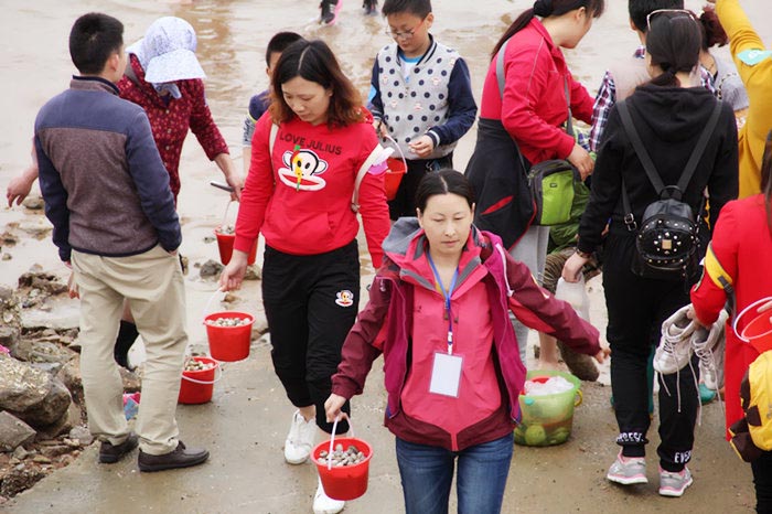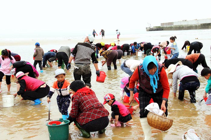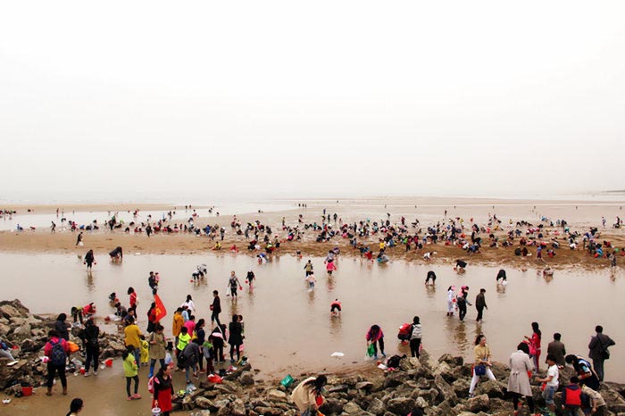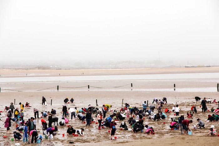 拎着小桶,带着孩子向滩涂奔跑,搂起耙子,挖掘埋藏泥沙里的宝贝,追着海潮,甚至光着脚丫踩在沙滩上,尽享赶海之旅。