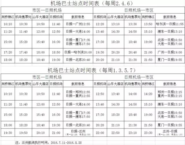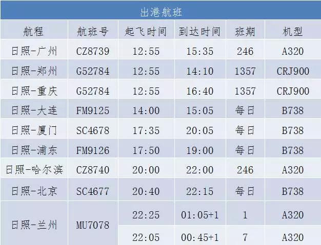 日照机场2016年夏秋航季航班时刻表(7月以后):