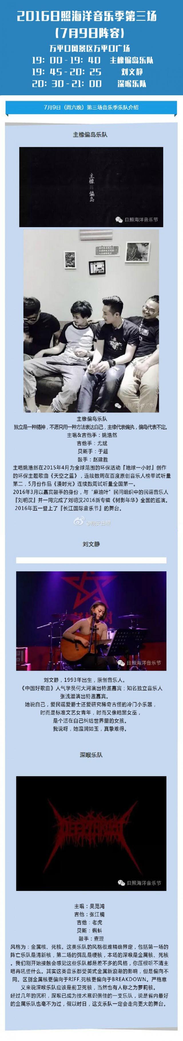 7月9日(本周六)晚上,日照海洋音乐季第三场演出将在万平口景区继续上演。作为日照海洋音乐节的预热表演,海洋音乐季第三场演出阵容为主橡偏岛乐队、刘文静和深喉乐队3支乐队参演,演出时间从7月9日19:00持续到21:30,本地市民持身份证或一卡通可免费观看。