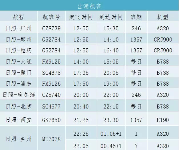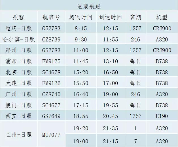 日照机场2016年夏秋航季航班时刻表