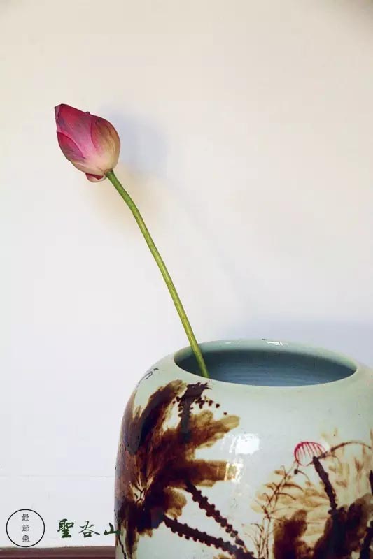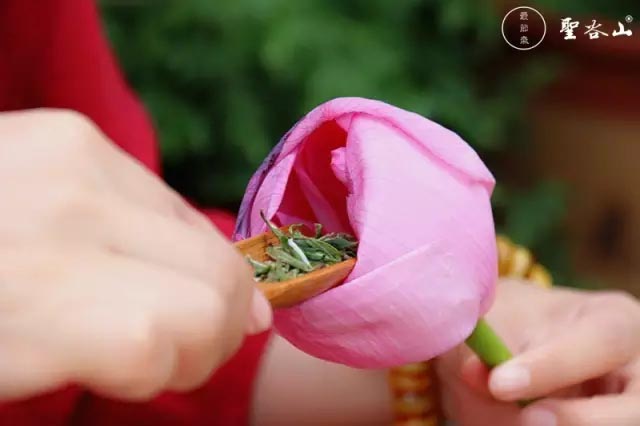 采一茎含苞欲放的荷花。插入盛满清水的瓶中。从顶部轻轻拨开荷的花瓣,把茶叶塞入花骨朵内,然后让花苞自动闭合。