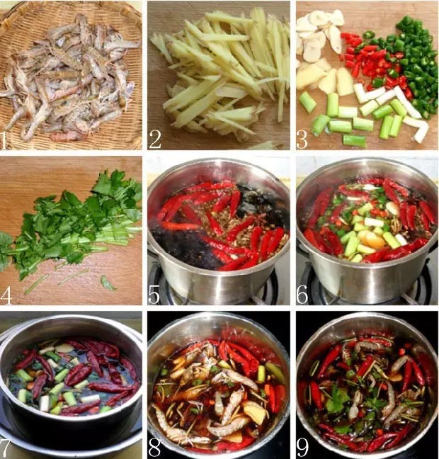 配料:姜、蒜、干辣椒、葱白、小红尖椒、杭椒、香菜、花椒粒、八角