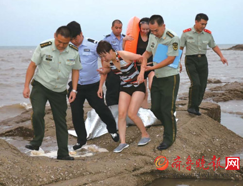 遇险游客被救上岸。齐鲁晚报记者 徐艳 通讯员 秦旭 摄 8月26日5名济南游客乘坐橡皮艇在海中游玩,翻船落水遇险;6名河南游客只顾着玩,却被上涨的海水困在礁石上。25日下午,日照公安边防支队任家台边防派出所的民警火速救援,成功帮助11名游客脱困。 25日下午5时许,日照公安边防支队任家台边防派出所接到市局指挥中心指令:有6名河南游客在渔海湾景区附近海域遇险,情况紧急,立即组织救援。任家台边防所立即启动应急救援预案,迅速联系吴家台村熟悉该海域情况的治保队员和救援人员,而此时,6名游客正站在海域内的礁石上焦急地等待救援。 由于当时正值涨潮,礁石较多,摩托艇无法靠近救人,民警只能通过抛扔绳索的方式施救,时间就是生命,也可能几分钟后,礁石就会消失在海水里。民警经过一个多小时的努力终于将6名游客成功救起。 经了解得知,当天下午4时许,6名河南游客在海边礁石上玩耍,由于不知道潮汐情况,再加上海上风浪较大,待发现涨潮时,礁石周围已经全是海水,幸好边防官兵及时救助,才使他们成功脱险。 无独有偶,25日下午,5名来自济南的游客乘坐橡皮艇在海中游玩,翻船落水遇险。边防民警迅速联合当地救援人员施救,将5名遇险游客救上岸。