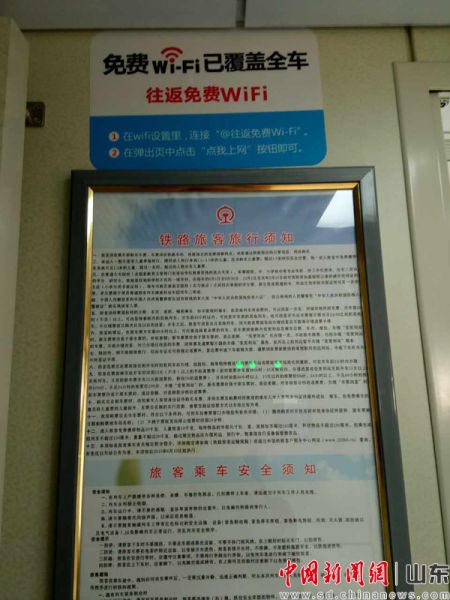 据济南时报报道,14日上午,记者在济南开往日照的K8285新空调普速列车上体验了列车Wi-Fi的高速便捷。按照安装提示,手机扫描二维码,点击关注后登录即可,整个过程只需 1分钟。经随车测试,Wi-Fi的下载速度最高可达125.8KB/ S,也就是相当于1M宽带。