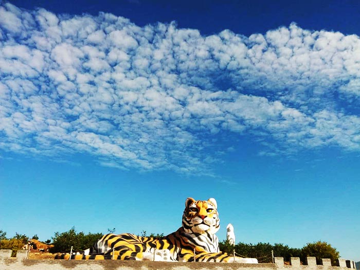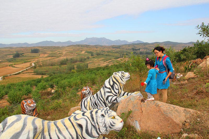 开园仪式结束后,游客们纷纷前往百虎园,观赏百虎奇观。睡虎山共建包含白虎在内的106只形态各异、栩栩如生的大小老虎造型。其中虎王长12米、高4.8米、宽3.6米,炯炯有神地卧于该园正门,极其显眼。