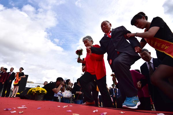 参加庆典活动的金婚老人携手登舞台