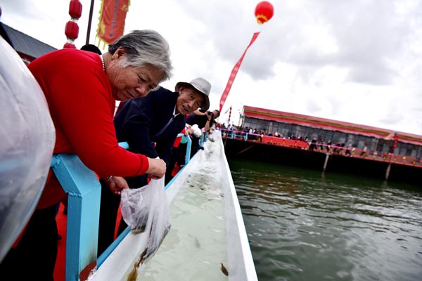 金婚老人在放流鱼苗 10月7日,一对参加庆典活动的金婚老人携手登上舞台。当日,“感恩父母 爱在海洋——日照市庆祝九九重阳节暨2016金婚大典”在岚山区顺风阳光海洋牧场举行。50对金婚老人通过讲述刻骨铭心的婚姻经历、倾听子女的感恩心声、祈福放流等活动,共同庆祝一起走过的50年婚姻生活。(本报记者 路杰 摄)