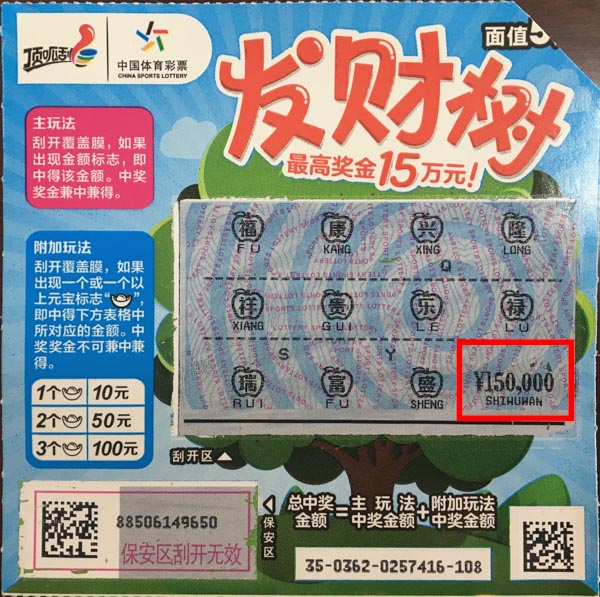 日照彩民顶呱刮“发财树”“摇”下头奖15万元(2016年10月26日)