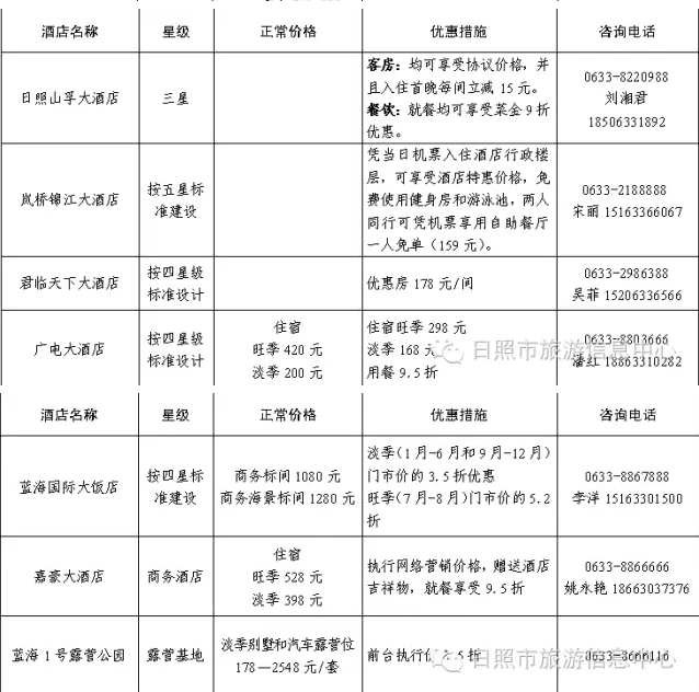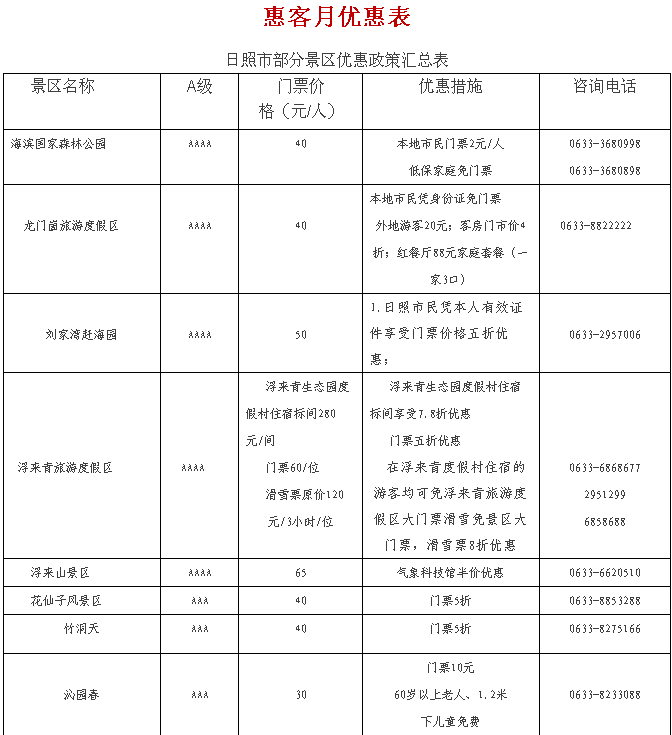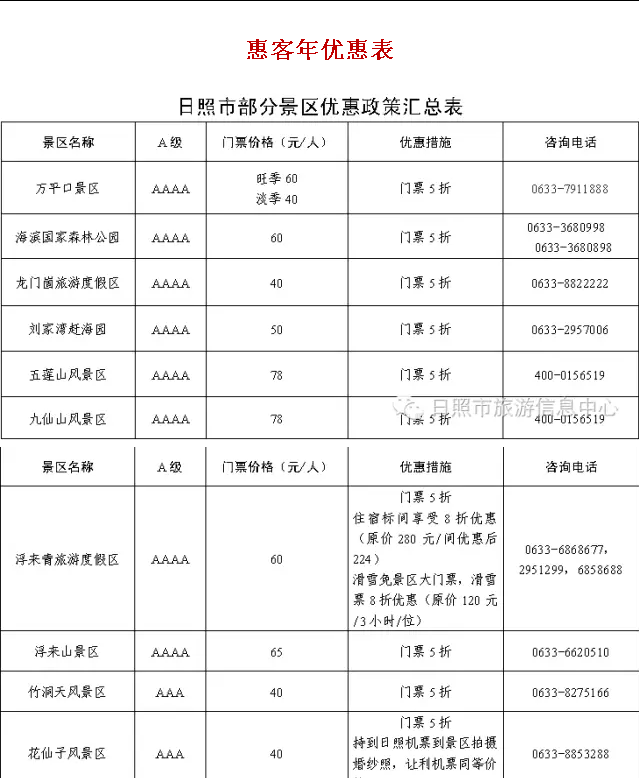 日照旅游惠客年活动以“机票在手·畅游日照”为主题,在2016年11月30日—2017年12月31日期间,游客凭到达日照机场的机票和身份证即可享受景区、酒店、餐饮的各种优惠活动。日照旅游惠民月活动以“畅游日照·共享发展”为主题,在2016年11月30日-12月31日,日照市本地市民凭身份证即可享受我市景区、酒店、餐饮的各种优惠活动。