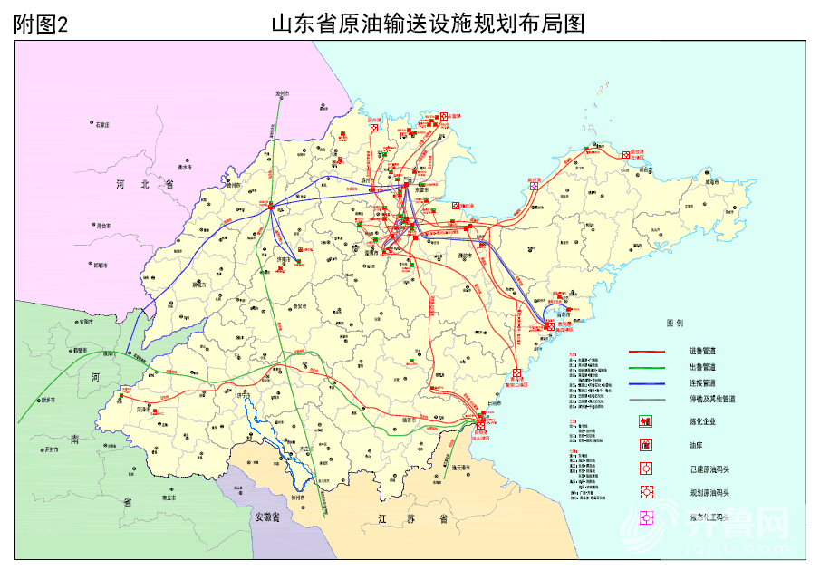 山东省发改委、经信委、交通厅联合出台全省油气输送设施规划建设方案,提出将在青岛、日照、烟台、潍坊、东营、滨州等港口规划新建13座原油码头、38座油品和液体化工品码头以及3座LNG码头,建成主要服务省内、辐射周边省份的油气海运体系。 管网建设方面,改造淘汰老旧管道,新建7条原油管道、7条成品油管道和7条天然气主干管道,年输送能力分别达到12800万吨、4450万吨和410亿立方米。