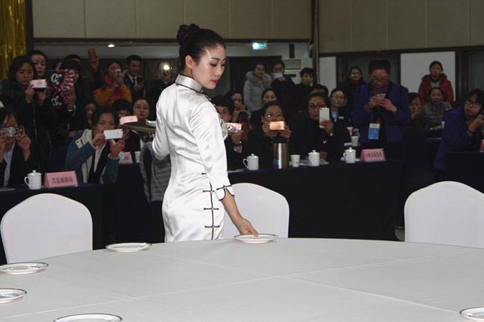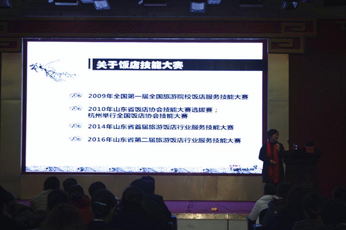 本次培训采用理论讲授与技能观摩相结合的方式进行。邀请了日照职业技术学院人文旅游学院教研室主任宁双进行理论部分的授课,她结合自身担任历届省级及国家级大赛的裁判以及指导老师的经历,以如何成为一名卓越的服务精英为课题主线,将酒店服务技能的国赛标准、易忽视的问题及注意事项进行了讲解总结,使在座的学员意识到站在领奖台前的光辉是由背后辛勤的付出与坚韧的毅力分不开的。