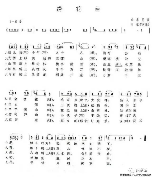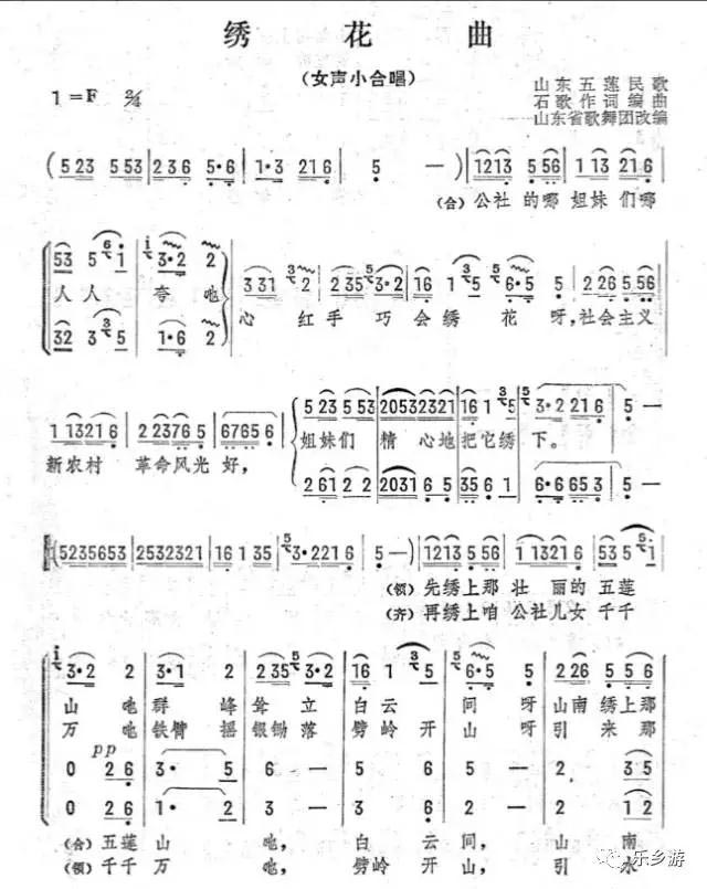 《绣花曲》 曲谱采用1957年秋五莲县文化馆部分工作人员协同青岛海军基地政治部文工队挖掘记录的五莲民歌《十二个月》,有音乐老师石歌(原名石恩典)编曲创作的。