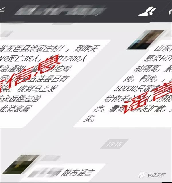 2月21日下午起,"今日五莲"微信后台陆续收到网友求证留言,说在微信群、朋友圈中看到信息,称“山东省五连县涂家庄村!到昨天感染H7N9死亡38人,其中1200人被隔离,紧急通知,暂时别吃鸡肉、鸭肉,因山东省五连县已有50000只家禽已感染。”