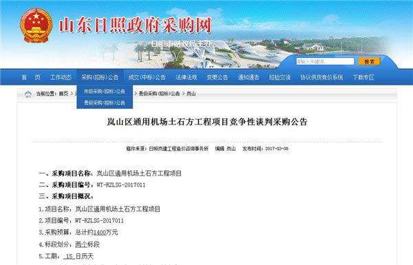 3月8日,山东日照政府采购网发布岚山区通用机场土石方工程需求公示,以及竞争性谈判采购公告等文件。