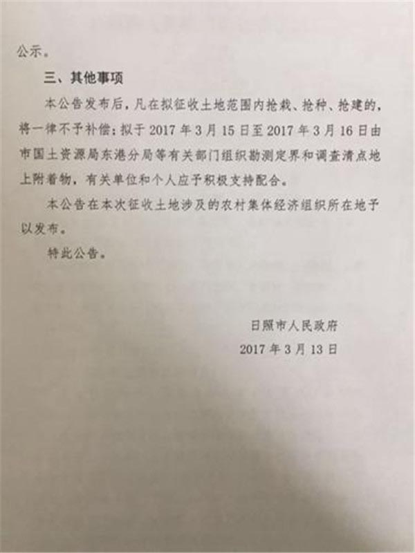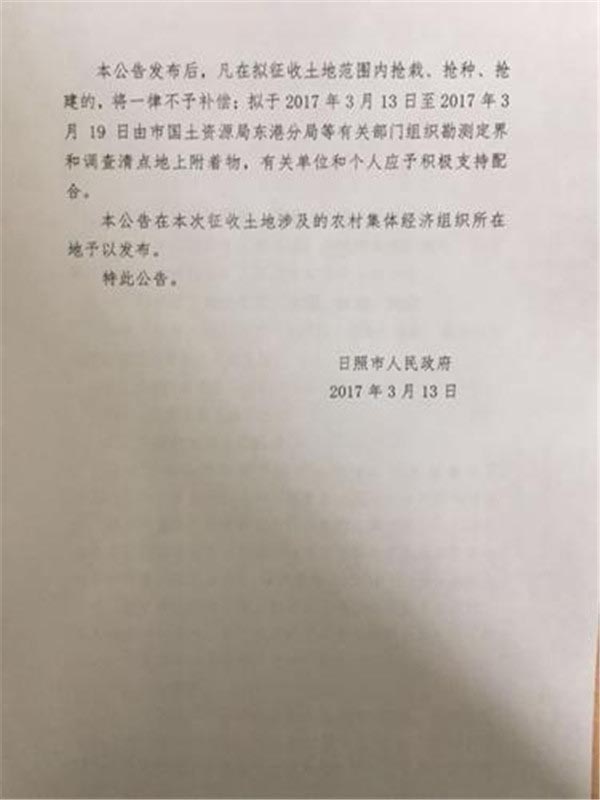 日照市拟征收土地公告:用于教育、交通和风景名胜建设(2017年03月14日)
