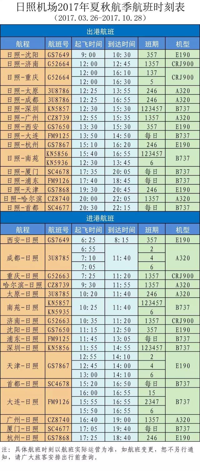 日照机场2017年夏秋航季天津-日照航班时刻调整(2017年04月19日)