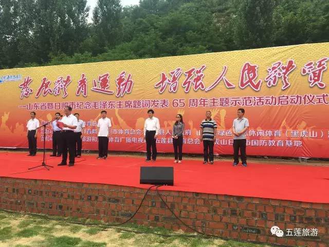 为纪念毛泽东主席题词“发展体育运动,增强人民体质”发表65周年,全面贯彻落实全民健身国家战略,积极响应中华全国体育总会发出的举办全民健身系列活动号召,倡导加强体育锻炼、提高健身意识的健康理念,深入推进全民健身活动持续开展,6月10日上午,山东省暨日照市纪念毛泽东主席题词发表65周年主题示范活动在山东省绿色生态休闲体育(黑虎山)基地举行。