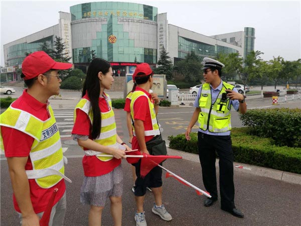 志愿者们举旗禁行,落旗放行,配合执勤交警指挥人车分流,耐心劝导市民按照道路交通标志及交通信号灯文明行路,引导机动车驾驶员文明驾车礼让斑马线,积极宣传“六大文明交通行为”,用实际行动共同为市民的交通安全保驾护航,为争创全国文明城市贡献力量。