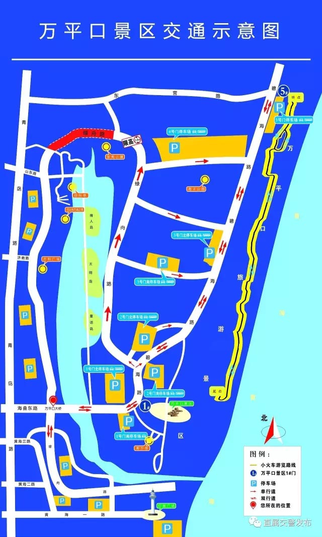 2景区内停车场均实行右转进出的措施,游客由各停车场均可顺利步行从景区1-5号门进入海边景点。