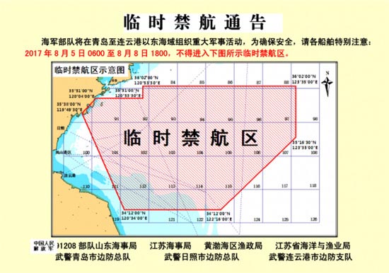 临时禁航通告:海军部队明起在日照以东海域组织重大军事活动!(2017年08月05日)