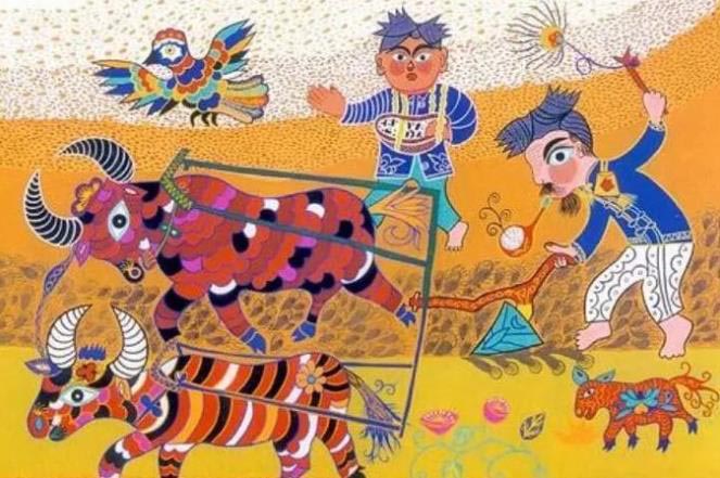 (所有参加的耕牛,统一贴好“酉”字或福字,戴好红花,由主人将牛牵到平坦开阔的地方,排成一排,鞭炮响起,主持人宣布开始,主人牵着牛缰绳,任牛随意跑一个来回,一试身板)。