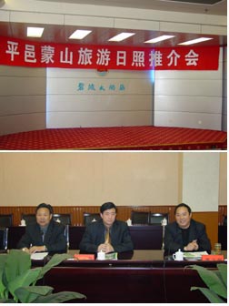 蒙山风景区旅游推介会今天在碧波大酒店举行,市旅游局副局长王立新、市场开发科科长张锡华及市各旅行社负责人参加了推介会,平邑县委副书记曹方俊、县人大副主任刘庆玺、县旅游局局长焦宝柱等分别就蒙阴风景区旅游资源、景区开发等情况做了详细介绍。 推介会上,蒙山风景区还与日照市各旅行社就门票优惠等方面签订了协议。