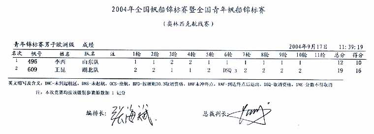 2004全国帆船锦标赛暨全国青年帆船锦标赛成绩(十九)(2004年09月21日)